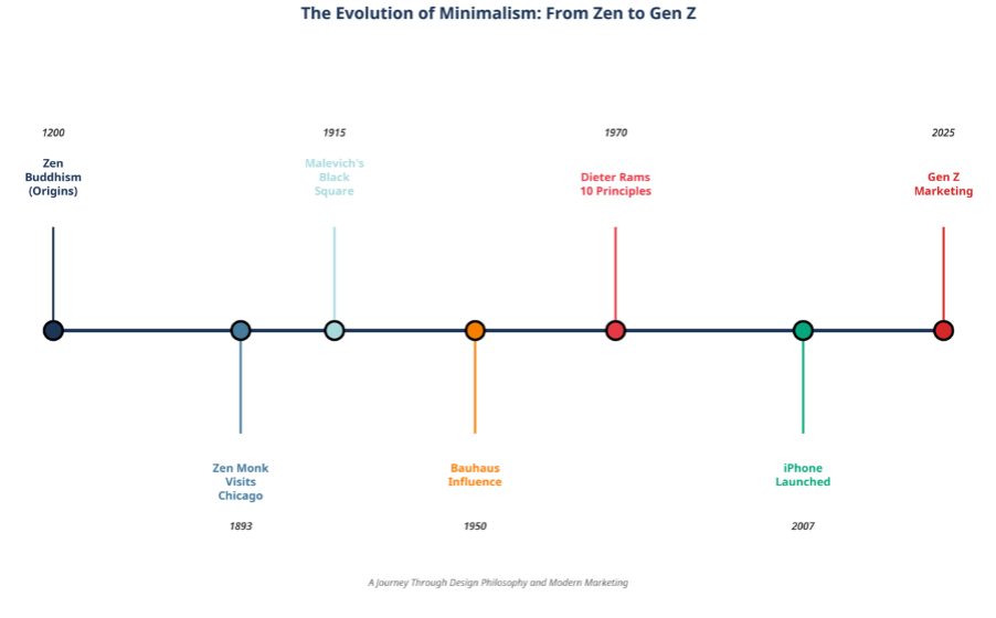 1893-ban egy neves zen buddhista szerzetes részt vett a chicagói Világvallások Parlamentjén. A nyugati művészek és tervezők körében ez az esemény indította el az érdeklődést a keleti filozófiák iránt. A „kevesebb több” gondolat elkezdett kézzelfoghatóbb formát ölteni: a dizájn megszabadult a díszítésektől, és az alapvető elemekre redukálódott.