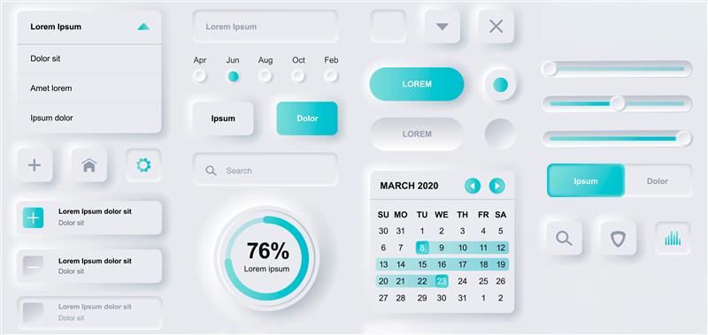 A neumorfizmus a flat letisztultságát ötvözi a puha mélységgel: hasonló tónusok, lágy fény-árnyék párok, enyhén domború vagy bemélyedő felületekkel dolgozik. Elegáns és prémium érzetet ad, de kockázatos a kontraszt és hozzáférhetőség szempontjából. Egyszerű widgetek, vezérlők esetében vagy márkaépítő mikrofelületeknél a mai napig jól működik.